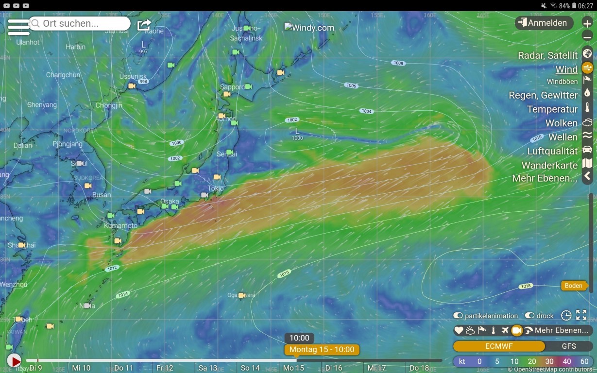 Mit unseren Freunden, die wenige Stunden vor uns in See gestochen sind, werden wir alle Tage die Position und die Befindlichkeit per Mail austauschen. Unser Ziel ist Dutch Harbor in Alaska (3300 Seemeilen). Pino segelt nach Victoria in Kanada, wo ihre Reise auch begonnen hat (4300 Seemeilen). Robusta ist mit VHF und Kurzwellenfunkgerät (SSB) ausgerüstet. Mails und Wetterbericht kann nur zu bestimmten Tageszeiten über das Pactor Modem gesendet werden. Dazu stehen 90 Minuten Sendezeit pro Woche zur Verfügung. Der Wetterbericht geht ebenfalls auf dieses Konto. Senden oder empfangen einer einfachen Email, dauert mehrere Minuten. Pino kommuniziert per Iridium Go, einem Satellitentelefon, welches zu jeder Zeit einsatzbereit ist. Zusammengefasst.. die Kommunikation zwischen Pino und Robusta beschränkt sich auf Emails. So haben wir uns das jedenfalls vorgestellt. Doch die Seeregion östlich von Japan liegt nicht im Abdeckungsbereich. Die eine Betreiberstation liegt in Brunei, die andere in Hawaii. Beide sind zu weit entfernt.