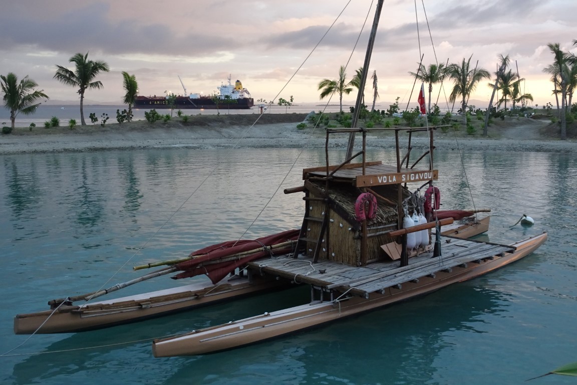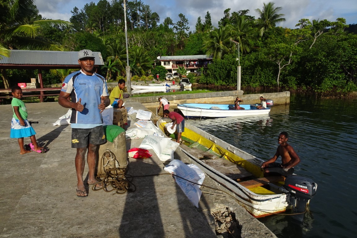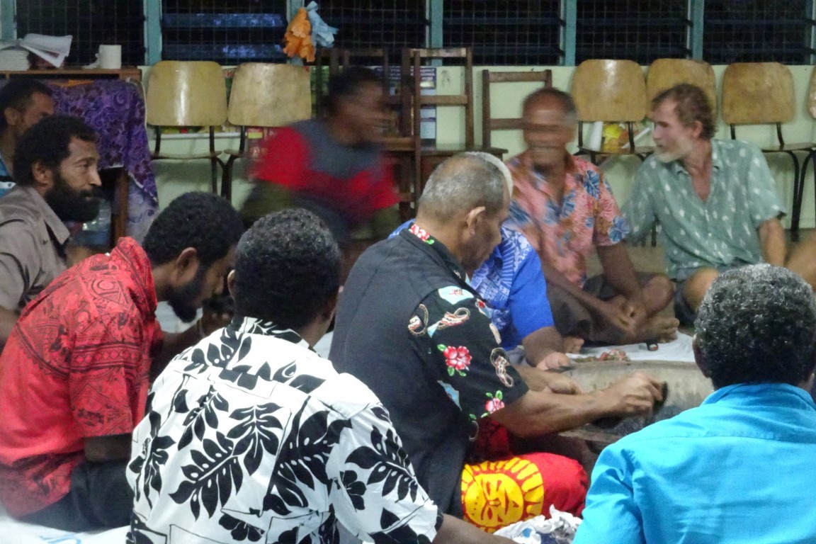 Am frühen Morgen, bevor wir weiter segeln wollten, kommt ein kleines Fischerboot daher. Die Insassen sehen wie schmuddelige Piraten aus. Allerlei Fischerutensilien liegen unsortiert im Kahn. Sie schenken uns sechs Kokosnüsse und Bananen und leihen ein Messer von uns aus, um ihre Köder zu zerlegen. Sie laden uns in ihr Dorf ein. Doch wir wollen weiter. Ich schneide vom frischen Kuchen für jeden zwei Stücke ab und überreiche sie ihnen mit einem kleinen Tütchen gemahlenem Kava.