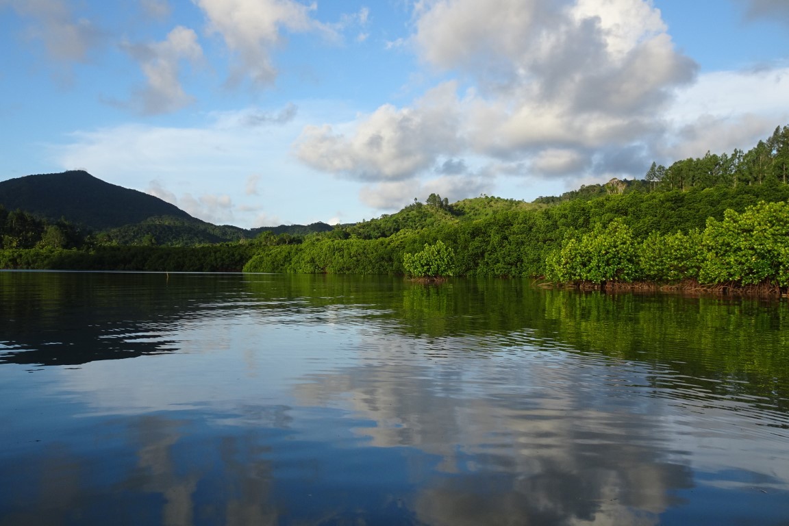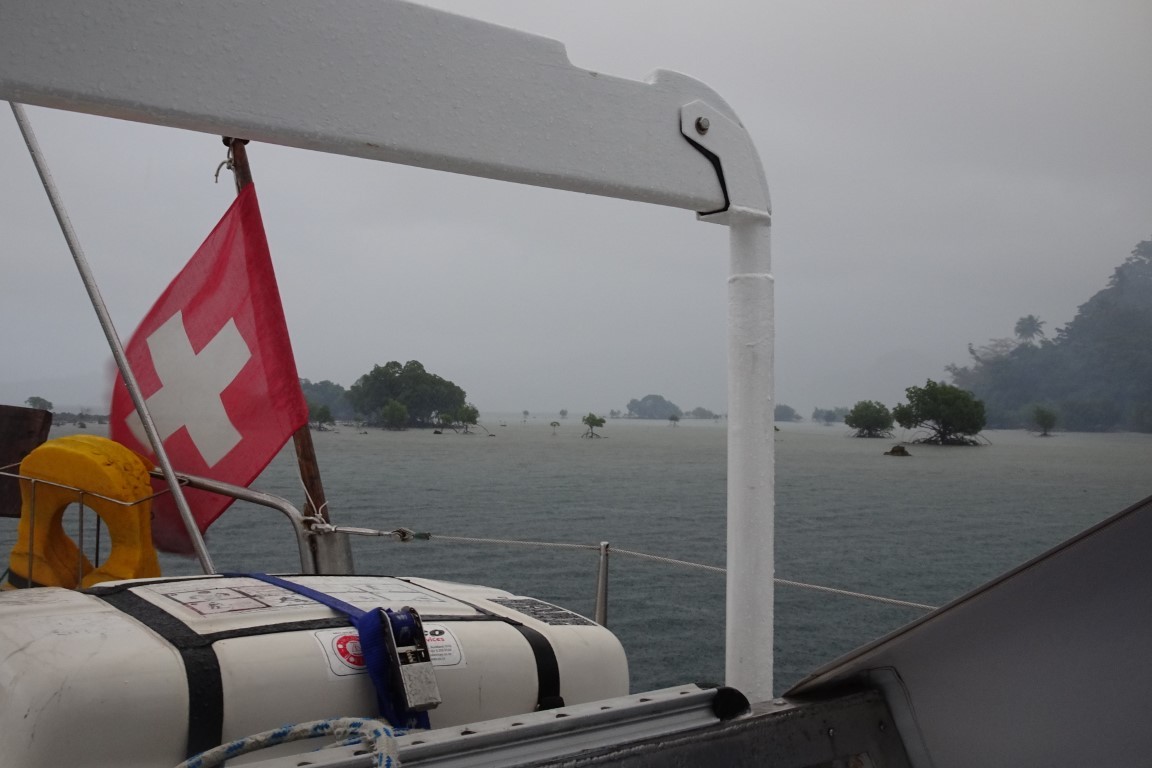 Am nächsten frühen Morgen sind wir pünktlich bei Hochwasser vor dem Nggilanngila Pass (wird tatsächlich so geschrieben). Die aufgehende Sonne verunmöglicht das Erkennen der Riffe. So orientieren wir uns an den Seekarten von Navionics und den weissen Landmarken am Ufer. Gerade vor Kurzem ist dort eine Yacht aufs Riff gescheppert.