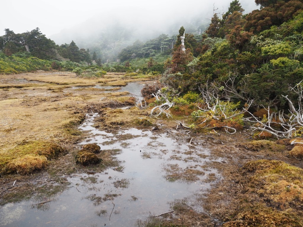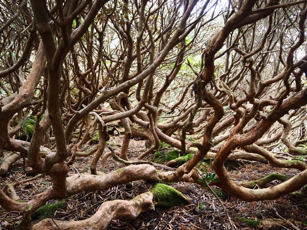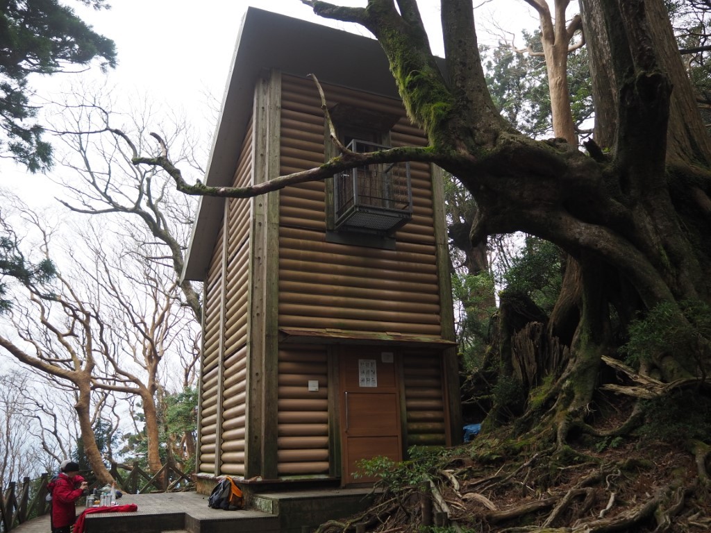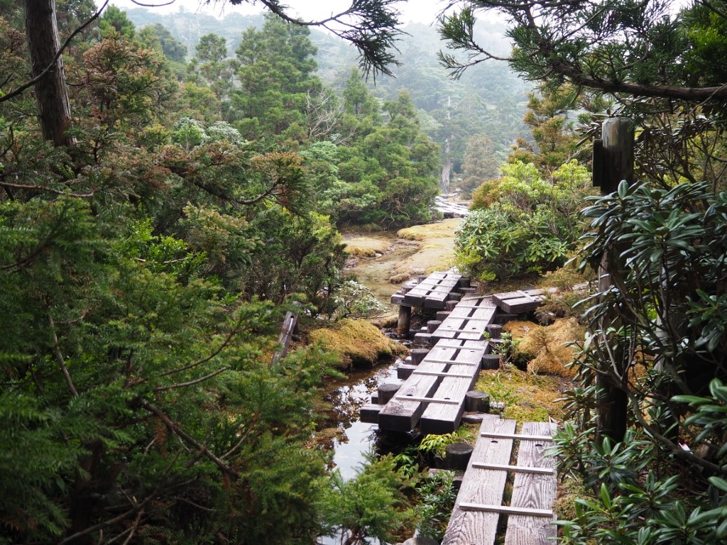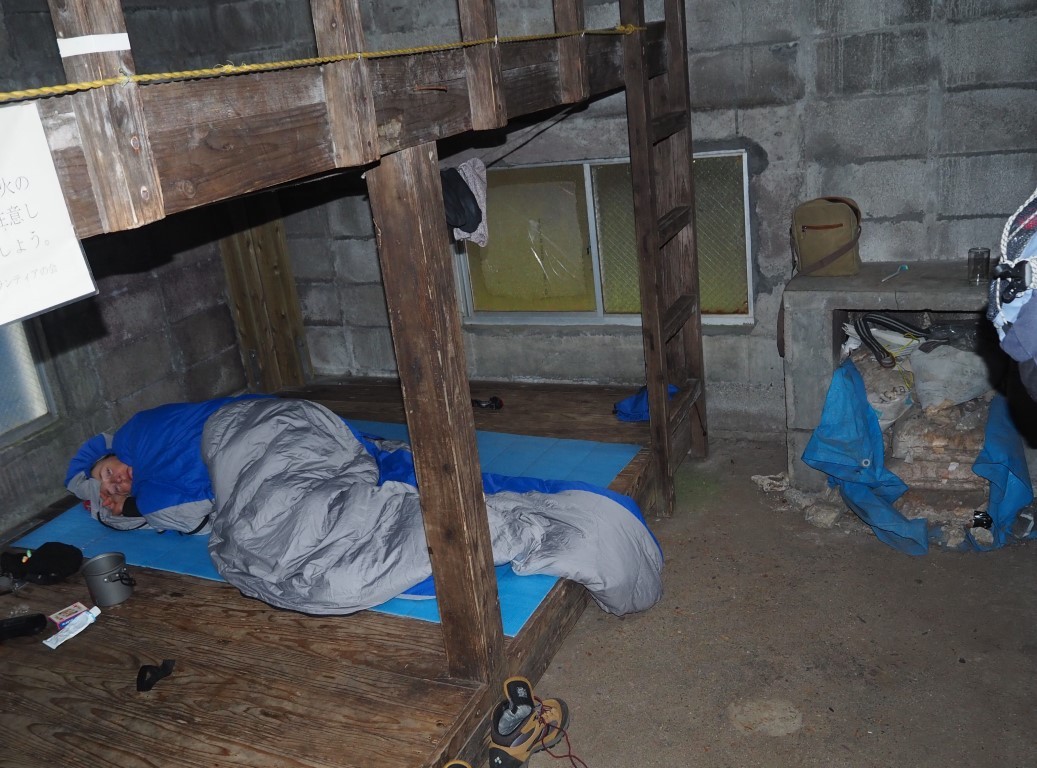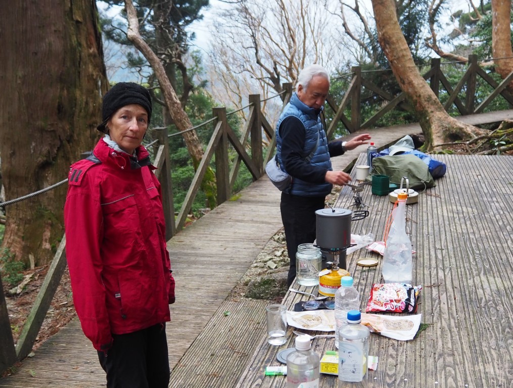 Die Landschaft wird karger. Es ist kalt. Wollpullover, Mütze und Windjacke kommen zum Einsatz. Ein Hochmoor liegt vor uns. Mount Miyanoura ist nicht zu sehen. Ueberall tolles Wetter, ausser in den Bergen von Yakushima. Statt das Picknick mit atemberaubender Fernsicht zu geniessen, schneit es. So verkrümeln wir uns weiter unten in dichtes Bambusgestrüpp. Nach acht Stunden Marsch, kommt endlich die Hütte in Sicht. Drinnen riecht es unglaublich gut nach Zedernholz! Die Nacht wird zum Horror. Kalt und die Regel bestätigt sich, eine Gruppenunterkunft ist erst heimelig, wenn auch das Schnarchmonster anwesend ist. Der ganze Holzboden vibriert! Sogar Thomas nervt sich. An Schlaf ist trotz Ohrstoepsel nicht zu denken. Ich versuche mich durch Meditation ins Lot zu bringen. Irgendwann packe ich die Taschenlampe und zünde dem Monster damit voll ins Gesicht.. . . .