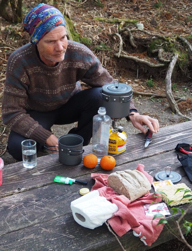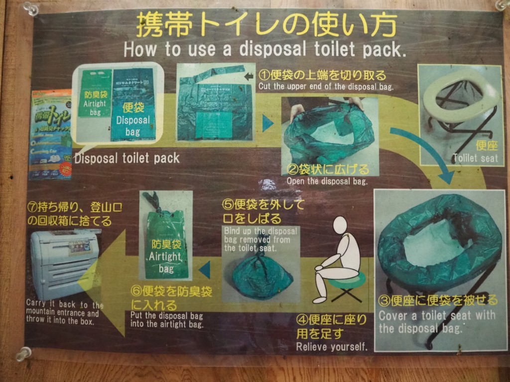 Robusta liegt nun sicher vertäut im kleinen Fischerhafen von Ambo. Das Wetter ist perfekt um sie mehrere Tage alleine zu lassen. Der Rucksack ist schwer bepackt. Leider nicht mit Schoggi, Käse und Cervelat. Die typische Schweizer Wurst, ohne die ein anständiges Picknick undenkbar ist fehlt. Stattdessen Instant Nudelsuppen. Zehn Packungen wiegen nur gerade mal wenige Gramm. Auch etwas gesundes ist dabei. Früchte Nüsse und Haferflocken und ein deftiges selbst zubereitetes Vollkornbrot, welches später von einem Bergführer in der Hütte mit grossen Augen bestaunt und getestet wird. Das Japanische Alpenklo ist was ganz spezielles: Im Sportgeschäft erwirbst du Plastiktüten, die über ein Gestell gestülpt werden. Dann weisst du selber was zu tun ist. Danach nimmst du das fertige Paket, gut zumachen nicht vergessen und nun ab damit in deinen eigenen Rucksack! Und schon ist dein Beitrag zum Naturschutz vollführt. Die Vorstellung, ich muss meine Kacke während mehreren Tagen über Stock und Stein schleppen, ist schon sehr befremdend. Und was ist mit der Pisse? Oder muss nur der Cervelat aufgefangen werden?
